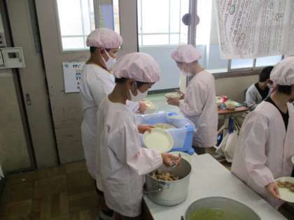 給食当番も自分たちで頑張っています。去年とは違い,二年生になったので階段も登らなければいけません。食器や,ご飯など重たいものも一生懸命運んでいます。