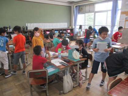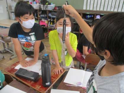 はかりの学習の終わりに,色々なものの重さを計ってみました。重さを予想して,ばねばかりや上皿天秤ばかり(1kg,2kg,4kg,8kg,12kg)の中の,どのはかりで計ればよいか考えて,計りました。小さいものはばねばかりを使い,重たそうなものは12kgまでのはかりを使うなど,自分たちで選ぶことができました。また,予想と本当の重さがぴったりになることもあったようで,重さの感覚が少しずつ身についてきたようです。
