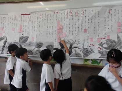 だいすきなばめんについて,ペアではなしあいました。ともだちのえらんだばめんやぶんしょうとおなじであったり,にていたり,ちがっていたりすることにきづき,いろいろなかんじかたがあることがわかったようです。