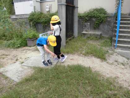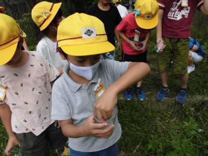 はたけにいって,いきものをさがしにいきました。バッタやてんとうむし,だんごむし,ふんころがしなどたくさんのいきものがみつかりました。「いきものとなかよし」というがくしゅうのテーマどおり,1ねんせいのこどもたちはいきものとなかよしです。