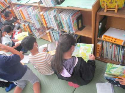 国語で,グループでの話し合いの仕方を学ぶ学習があります。そこで,1年生に本を好きになってもらうために読み聞かせるための本を選ぶことを目的とした話し合いをします。今日は,自分の考えをもつため,図書室で,一年生に読み聞かせればよいと考える本を探しに行きました。みんな,懐かしそうに絵本を手にしていました。
