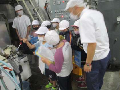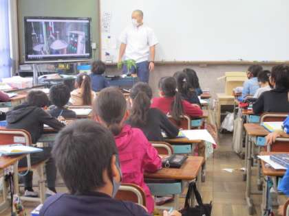 今日は,1組の子どもたちが,こんにゃく製造工場へいきました。まずは,学校で,工場の社長さんからビデオを見ながら作り方の説明をしていただきました。その後,2グループに分かれて工場を見学しました。子どもたちは,初めて見る機械やどんどん出てくるこんにゃくに興味津々でした。明日は,2組の子どもたちが行きます。