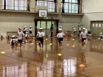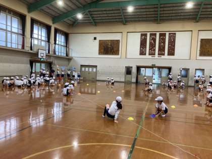 今日は,あいにくの雨だったので,ハードル走の練習を体育館でしました。ハードル走では,子どもによってインターバルが違うので,ハードルの位置を動かさなければいけません。そこで,担当の子が走者の挙げたプラカードの数字を見て,ハードルを動かします。子どもたちは以前の体育の学習でやっていたように,素早く動いていました。今日はミニコーンをハードルに見立てて練習しましたが,来週は本物のハードルを使って練習していきます。