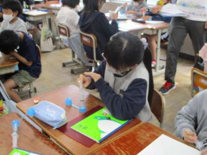 理科「とじこめた空気と水」の学習では,注射器を使い空気を閉じ込め,閉じ込めた空気に力を加えると空気の体積や手ごたえはどうなるのか,実験をして確かめました。