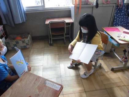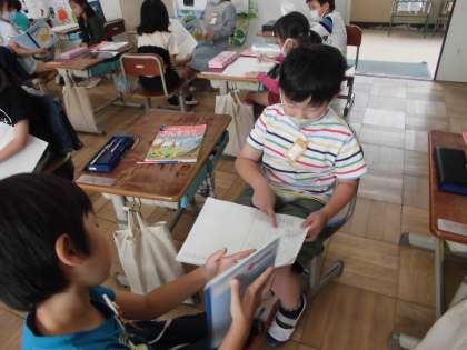 さんすうで,たしざんのけいさんのしかたををかんがえました。ずやえをつかってじぶんのノートにかんがえをかいています。かんがえたことについてノートをみせながらペアでがくしゅうしているようすです。