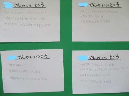 今日の道徳「お母さんの「ふふふ」」では,自分や友達のいいところを書きあいました。毎日いいところ見つけで,友達のよいところを発表し合っているので,友達のよいところはすぐに書けていました。自分のよいところを書く時には「むずかしい…。」と言っている子もいました。自分のいいところは自分自身ではなかなか見えにくいものです。でも,それぞれにいいところはたくさんあります。自分のいいところに自信をもってほしいと思いました。授業後には,たくさんのいいところカードが集まりました。