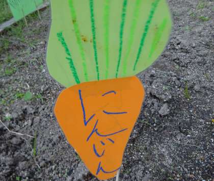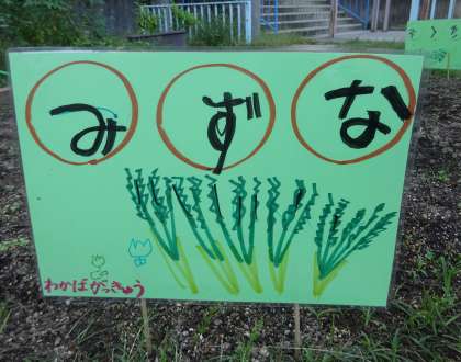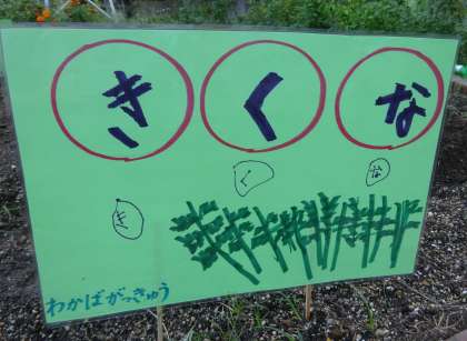 畑に野菜(菊菜,水菜,人参)の看板を立てました