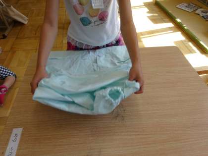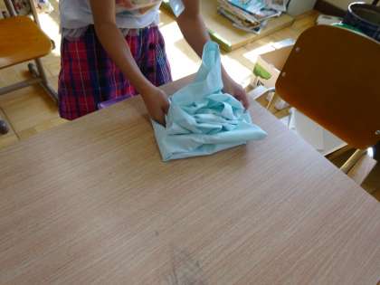 給食のエプロンのたたみ方の練習をしました。