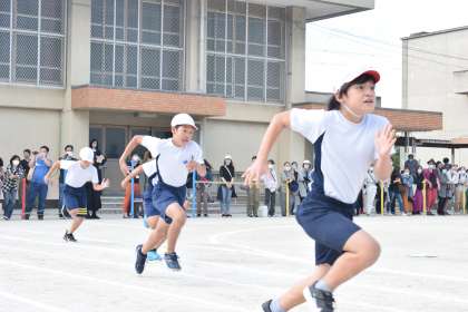 100メートル走です。1人1人がゴールを目指して一生懸命走り切りました。