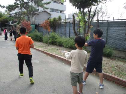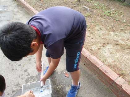 外に出て行い,空気と水の玉の飛び方の違いをそれぞれの性質の違いから考えました。