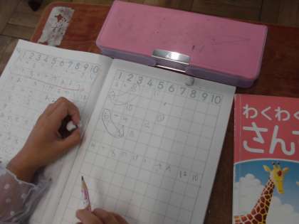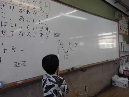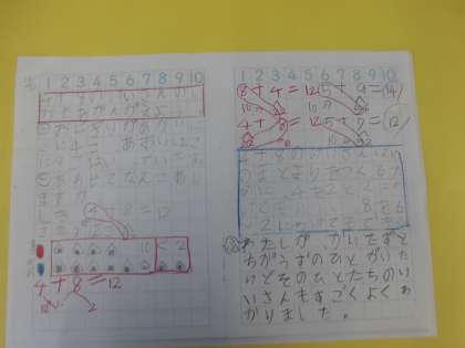 じぶんのかんがえをせつめいしたり,みんなではなしあったりしてかんがえをふかめていきます。みんなのまえでせつめいするだけではなく,ノートにかんがえをまとめることもすこしずつすすめています。ノートめいじんをめざしてがんばっています。