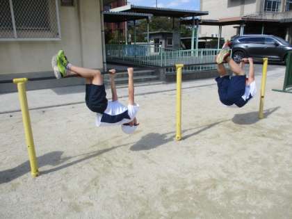 てつぼうあそびが始まりました。今日はからだならしをしてから,「ダンゴムシ競争」と「こうもりじゃんけん」をしました。