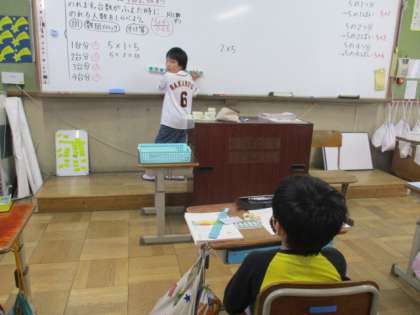かけ算の学習を頑張っています。5人乗りのジェットコースターの台数が増えていくとどうなるか,数図ブロックをもとにしてかけ算の式に書きました。気づいたことを話しあうと,「答えが5ずつ増えている」「かける数は1,2,3,4…と1ずつ増えている」「かけられる数はずっと5のままだ!」とたくさんの意見がでてきました。