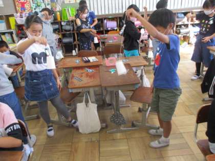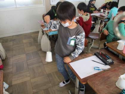 今週から,工作「ゴムゴムパワー」の学習に入りました。ゴムの力を使って,紙コップが上下に不思議な動きをする様子を見せると,「おー!」という声が上がりました。自分たちも作ってみたいという思いをもって,仕組みづくりにとりかかりました。苦戦しながらも班の友達と協力して一人一つ仕組みを作り,作品のイメージをふくらませました。