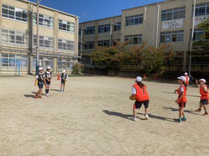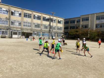 体育科では,陣取ゲームをしています。初めはルールを理解するのが難しかったのですが,だんだん慣れてきて楽しく試合ができるようになってきました。ボールを横か後ろにしか出せないので,周りのチームメートの動きが重要になってきます。子どもたちは,作戦を立てながら,よりスムーズにパスを回してゴールを目指しています。