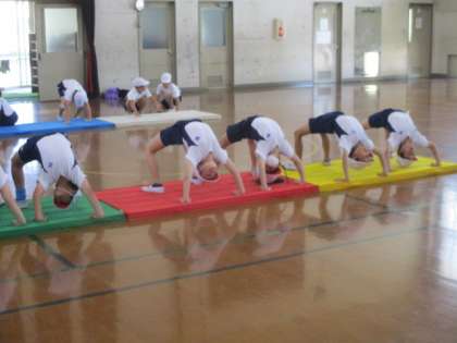体育では,マット運動の学習をしています。準備の後,グループで体操をして,体慣らしの運動で,だるま転びやロバキック,ブリッジなどの運動をします。(写真1)どのグループもとても取掛かりがはやく感心しています。