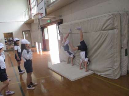 ねらい2の時間には,ちょっと頑張ればできそうな技に挑戦します。踏切板を入れて坂にしたマットで,前転や後転の練習をしたり,壁をつかって倒立の練習をしたりと,それぞれが自分に合った場で練習をしています。(写真3)1時間1時間できることが増えているようです。