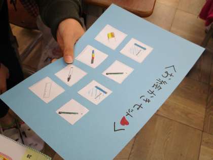 「友達はどんな物をよく使うかな。」,「どんな物が必要かな。」とよく考えながら一生懸命組み合わせたり,色を塗ったりしました。また,そのセットにネーミングを付けました。