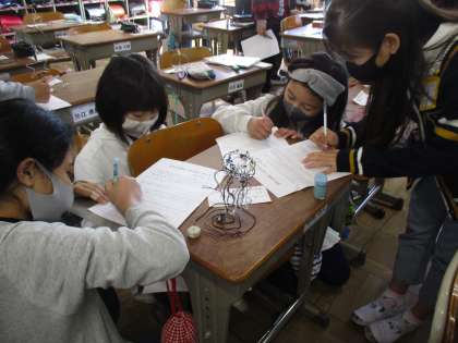 針金で作った「未知の生物」が完成しました。そこで,みんなで作品鑑賞をしました。