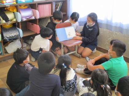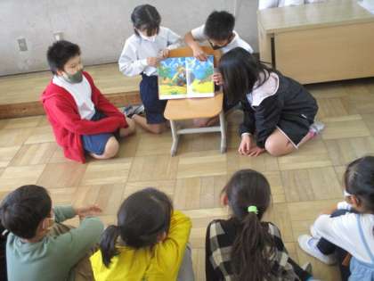 今日から3日間,2グループごとに,1年生の教室へ読み聞かせに行きます。以前の国語の学習で,1年生へ読み聞かせをするための本を決めるための話合いをしました。その話合いで決まった本を読み聞かせました。初めての体験で,とても緊張した様子でしたが,頑張って読み聞かせしていました。