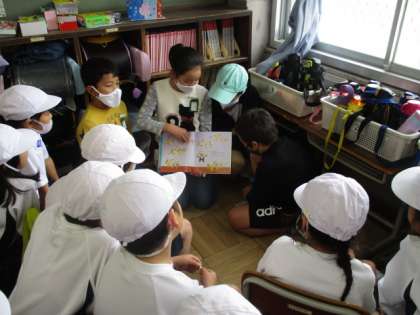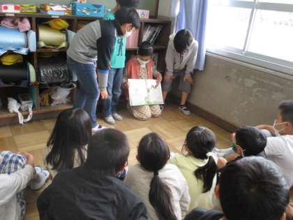 今日は4つのグループが,1年生の教室に読みきかせに行きました。読み終わった後,1年生に感想を聞くなど,本を通して交流を深めることができました。