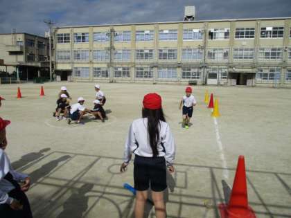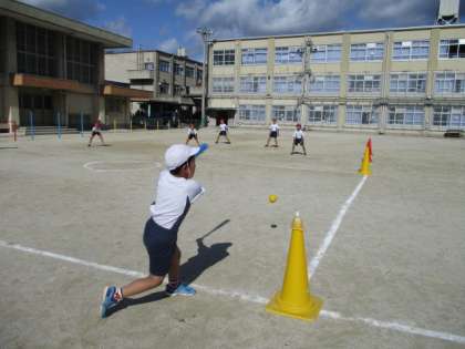 今週から,ベースボール型ゲームの学習に入りました。ベースボールのルールは複雑なので,誰もが点をとるチャンスがあって,誰もが守備に参加できるゲームに変えて取り組んでいます。だんだんと,バットがボールにしっかり当たるようになり,ボールがよく飛ぶようになってきました。みんな楽しそうにゲームに取り組んでいます。