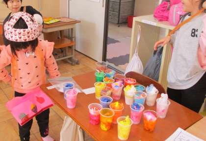 ジュース屋さんにたこ焼き屋さん,コンパスの学習で作ったブンブンゴマ屋さん。どの子どもたちもとても楽しそうにお店を回っていました。そして,上級生が1年生の名前を優しく呼んだり,手を引いてあげたりする姿があったことがとてもうれしかったです。