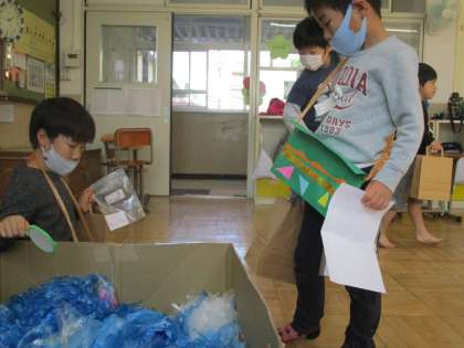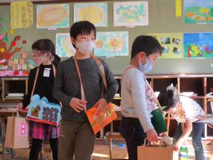 先生が声を掛ける前に,2〜4年生が1年生に声を掛けてペアを作っていました。手作りのカバンを持たせてあげて,チケットを確認してくれました。