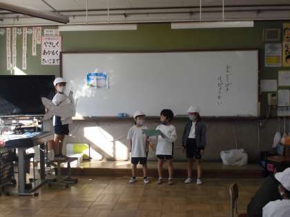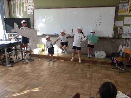 「くじらぐも」のおんどくげきはっぴょうかいをしました。かいわぶんをつけくわえたり,どうさをつけたりしてはっぴょうしました。ちょうど,たいいくのじゅぎょうのまえのじかんで,くじらぐもの1ねん2くみになったきぶんでおんどくすることができました。おんどくすることがたのしいとかんじたようすでした。