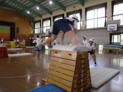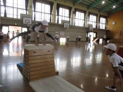 新しい技に挑戦したり,できる技で跳び箱の高さを変えて挑戦したりしています。