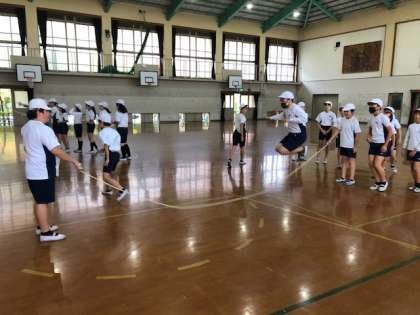 体育科の学習では,ジョギングと縄跳びをしています。大縄跳びにも挑戦しています。苦手な人も得意な人が上手にアドバイスをして跳ぶことができました。みんなで一つのことを楽しめるよさを感じられたと思います。