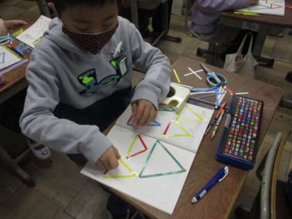 3学期,はじめの算数の学習は,三角形です。今日は,色々な長さの色棒を使って,色々な形の三角形を作りました。それぞれが楽しそうに活動していました。明日は,作った三角形を仲間分けしていきます。