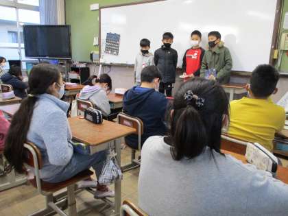 朝の会でグループごとに冬休みに読んだ本を紹介し合っています。