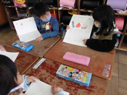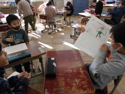 ふゆ休みのおもい出を日きを見せながらはなしました。グループでとてもたのしそうにはなしていました。たのしいおもい出をこうりゅうし,3学きもえがおのスタートとなりました。