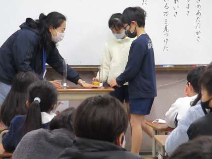 「朝のお薬を飲み忘れたよ。夜にまとめて飲んでいいかな。」や,「薬をお水で飲むのは苦手だな。ジュースで飲もう。いいかな。」等○×クイズでした。さらに,ジュースで薬を飲んだ時にはどのようなことが起こるのか,メスシリンダーを使って実験もしていただきました。薬にジュースを加えた方はぶくぶくと泡がわきでてきて,体の中でこんなことが起こるなんて危険だ,と子どもたちは驚いていました。