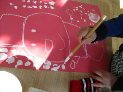 赤色の色画用紙に 白の絵の具やクレパスを使って