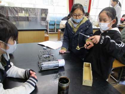 今回は実験用ガスコンロで火を使う実験でしたが,子どもたちは十分危険を理解し実験を行うことができました。