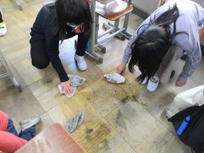 書写の学習の後,自分の片付けが終わっている子が,後片づけの際にこぼれてしまったぼく液を見つけ,ぞうきんをぬらしてきて,ゆかのぼく液を一生懸命にふいてくれていました。