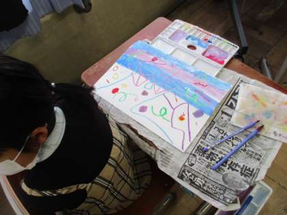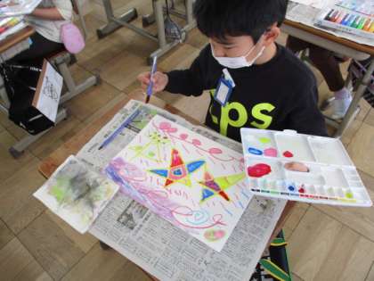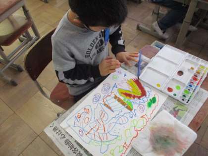 今日は絵の具とクレパスを使いました。まず,クレパスで自由に線や模様を書きました。その後,二色以上の色を混ぜて色を作りながら,好きな色をクレパスに重ねて塗っていきました。