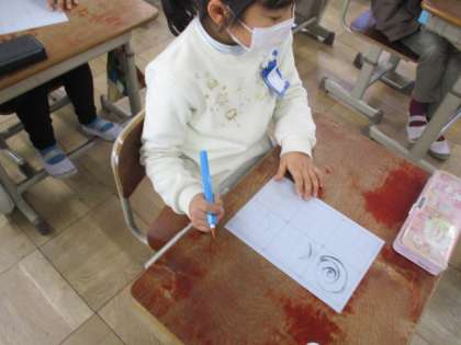 今日は初めて水書の学習をしました。初めてだったので,水書の正しい使いかたをみんなで確認したあと,筆を使って線や波線を書いたり,うずまきをかいたりしながら筆の使いかたを学習しました。「とん・すう・ぴた」の合言葉をもとに,力をだんだん抜いて書いたり,力を入れて書いたりと違いも比べてみました。