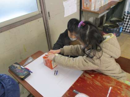 次は写し取った紙を使って自分たちで箱をつくってみます。「早くはこをつくりたいです」と次の活動を楽しみにしている子どもたちでした。