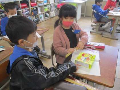 今日は算数の学習で,はこについて調べました。新しく「面」という言葉を知り,はこには面の数はいくつあるのか,面の形はどんな形なのかをペアで協力して調べました。