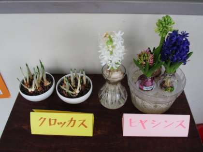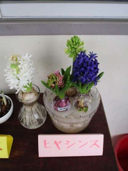 校長室の前で,ヒヤシンスとクロッカスの水栽培をしています。先日からヒヤシンスは花が咲き始め,廊下に甘い香りが漂っています。