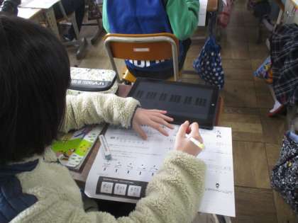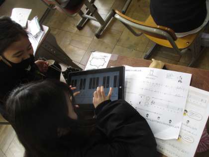 子どもたちは,普段とは違う道具を使っての演奏に戸惑っているようでしたが,各々で旋律を考え,タブレットから発する音を真剣に聞いていました。
