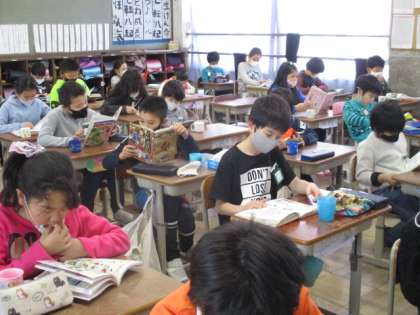 今週はスイセン読書週間でした。図書室では,3冊の本をかりることができました。読書を始めると,教室はシーンと静まり,みんな集中して読み進めています。ぜひ,家庭でもテレビを消して,シーンとした部屋で,家族みんなで読書に親しんでみてはいかかでしょうか。