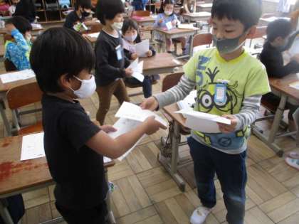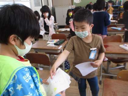 国語科「どうぞよろしく」で,名刺交換をしました。とても嬉しそうに,ちょっぴり恥ずかしそうに交換していました。早く友達の名前を覚えて,仲が深まればいいなと思います。