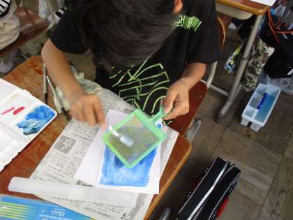 金網にぬった絵具を,ブラシでこすって霧吹きの効果を楽しみました。
