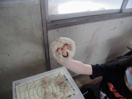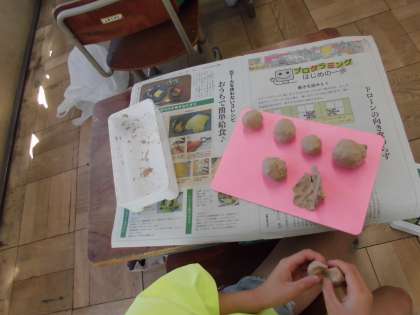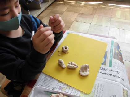 2年生の子どもたちは,ねん土が大好きです。かたくなったねん土をちぎったり,まるめたりしやわらくしたあと,ねん土をにぎってみました。ねん土をにぎってみると,いろいろなもようやかたちができました。