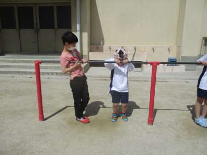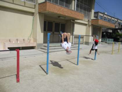逆上がりや前回りなどの技にチャレンジしたり,鉄棒にぶら下がったりして楽しく学習することができました。