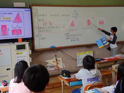 黒板の前でも,クラスのみんなに向けて,図を指し示しながら,図と式を結び付けて説明することができました。